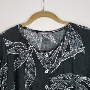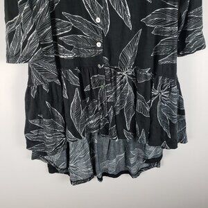 Alembika button up tunic top high low ruffle hem womens Small black palm leaf