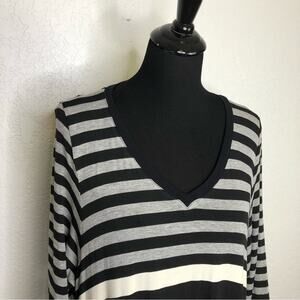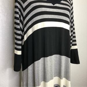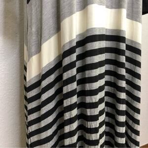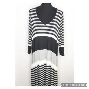 Alembika black cream gray striped v neck maxi dress. Pullover style with v neckline. Midlength sleeves. Double side pockets. Brand and size tag have been removed but best fits size 5 or US 14-16 based on measurements. Excellent preowned condition. Minor wash wear. One tiny snag.
