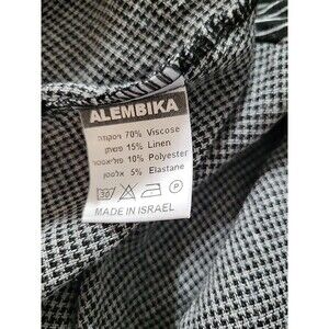 The Alembika asymmetrical hem dress in size 3 features a mixed pattern of black and white stripes and houndstooth, making it a stylish and versatile piece for various occasions such as travel, parties, casual outings, and business events. This sleeveless dress with a scoop neckline and front pocket is made of linen, polyester, viscose, and elastene ensuring comfort and breathability. The dress has a midi length and an A-Line style, with a subtle accent of mixed pattern fabrics and a convenient pocket detail. Ideal for the summer and spring seasons, this dress is machine washable for easy care and maintenance.