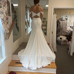 It’s the details that make the difference: a structured corset bodice, a cut out at the back, off-shoulder sleeves and bustier draping make the Kerria gown the one and only. Rich crepe satin fabric creates an elegant silhouette when walking down the aisle. This gown will complement your figure like no other while leaving much to the imagination.