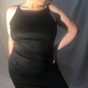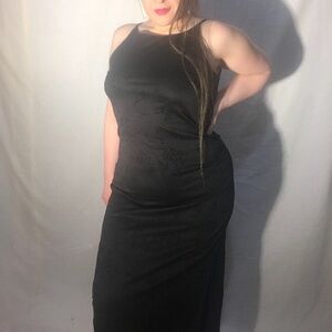 This is a beautiful Black long maxi dress by Alesia. Made from 100% polyester. Has slits on both sides of dress for a really classy but still sexy look! ❣💯 Has black on black print of flowers in oriental style print. Has spaghetti straps top part of dress like a tank top style. Then falls freely. Slits went approximately to knee length on me in pics I'm 5' 1". Also fit me snug at time. Could wear a cute short sweater or nice shawl .This dress was made in El Salvador!!! Gorgeous 💯❣🥰👍