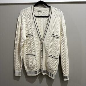 Alessandra Rich Cable Knit Cardigan Sweater in Ivory. Size IT 36 = XS. Features cable knit design, v-neckline, long sleeves, dropped shoulders, button front closure, patch pockets, striped edges, ribbed trim detail, tunic length, oversized fit. 100% cotton. Great used condition, no notable flaws.