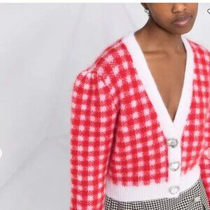 Alessandra Rich Red and White Plaid Wool Blend Checked Jacquard Cardigan