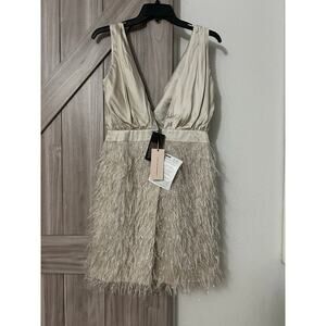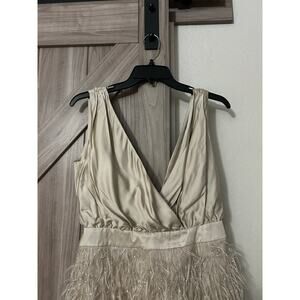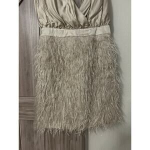 Elegant mini dress with feathered skirt. Sleeveless design. Perfect for special occasions.