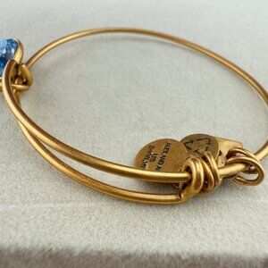This gold-tone Alex and Ani adjustable bangle bracelet features a striking blue teardrop charm. Designed with signature charm tags, it exudes elegance and symbolic significance.