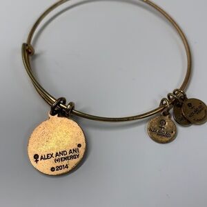 Alex and Ani gold finish lucky four leaf clover Charm Bracelet. Circular clover charm and three small charms on gold bangle. Bangle expands 2.5”-3.25”.