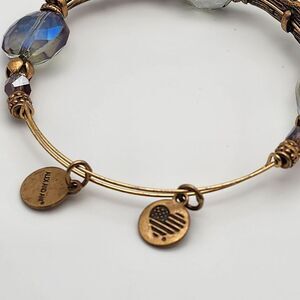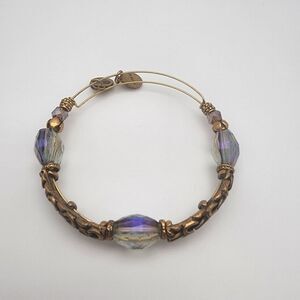 Alex and Ani Enchancted Mulberry Rafaelian gold tone bracelet with three large iridescent Swarovski Crystal beads and two smaller Swarovski Crystal beads.
