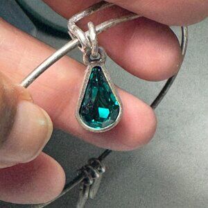The vintage bracelet with the green teardrop-shaped charm and engraved discs is an Alex & Ani piece—most likely from their Birthstone Collection.