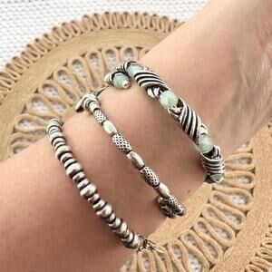 From Alex & Ani. Bundle lot set of 3 silver tone bracelets. Includes evolution of the heart wrap bracelet; milkweed forests wrap bracelet and silver large beaded bangle beaded. Preowned in good condition with no stains or tears. Light signs of wear.