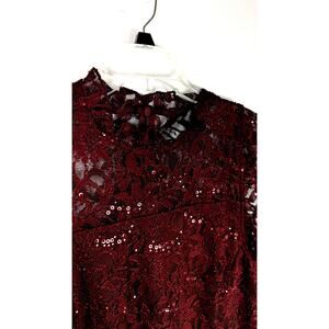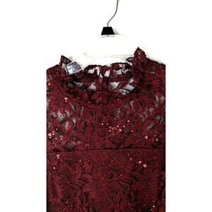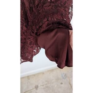 Alex B nites maroon lace dress 12p lined some sequins ruffle neck sleeves hem