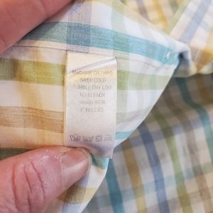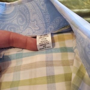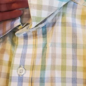 Shirt has a white background with teal, grey, green, blue and yellow making a check pattern. There is a blue and white paisley print inside the collar and a left breast pocket.