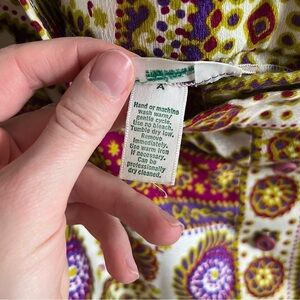 Step back in time with this stunning Alex Coleman vintage 1970s maxi skirt. Featuring a vibrant palette of pink, purple, gold, orange, and red, this skirt is a true statement piece. The button-up front and soft textured, woven poly blend ensure comfort and style, while the fabric's resistance to wrinkles makes it perfect for any occasion. Unlined and in excellent used condition, this skirt is a must-have for vintage fashion enthusiasts.