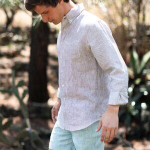 A yarn-dye striped button-down shirt made with sustainably-grown French linen and washed with biodegradable softeners. The buttons are made with corozo, a Brazilian nut known as "plant ivory."