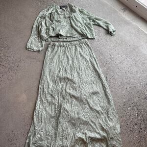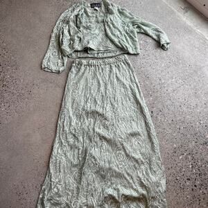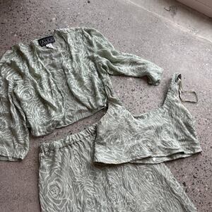 Cropped jacket cropped tank top and maxi silk skirt set.