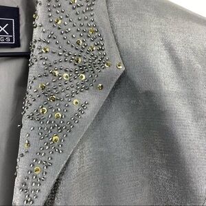 Green matching set, beaded detail, midi length dress with back zip closure, matching jacket. Both size 10. Good pre-owned condition. Some pulling near back zipper of dress. No actual damage, holes or tears. See last photo for reference.