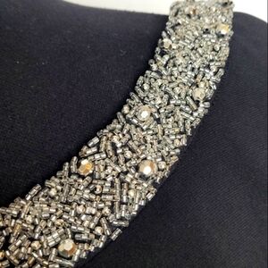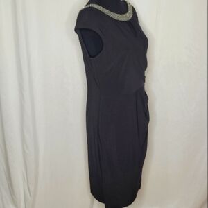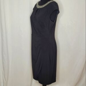 No need for extra jewerly. Sparkling beads illuminate the neckline of this elegant sheath dress made with plenty of stretch for fluid movement.