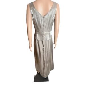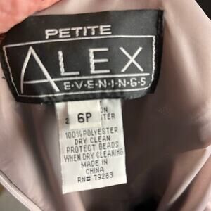 This Alex Evenings sleeveless maxi gown in a champagne and tan color has a beaded blouson type top and a long slinky tan skirt. 75% rayon, 25% polyester with a polyester lining. Dry clean. Mother or grandmother of bride, cocktail party, New Years, homecoming, prom, ball.