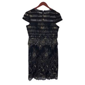 Alex Evenings Black Gold Lace Short Sleeve Dress. Size 8P. Black and Gold Lace. Stripe and floral patterns. Zipper back. New with tags.