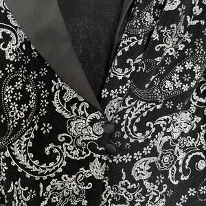Alex Evenings Black Paisley Print Satin Shawl Collar Chiffon Long Sleeve Jacket