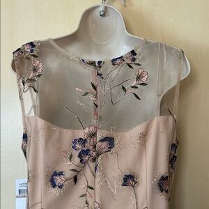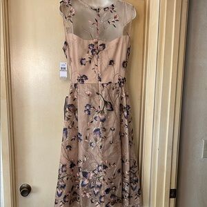 Alex Evenings blush midi dress with intricate embroidered floral patterns. Illusion top with slip style lining. Fitted to the waist and flares to a full skirt. Double lined with a crinoline at the hem. Perfect for special occasions. New with tags.