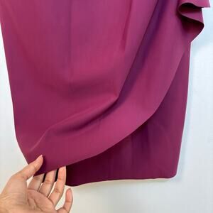wine hue, compression fabric, knee-length hem, concealed back zipper, fitted silhouette,