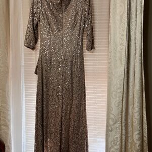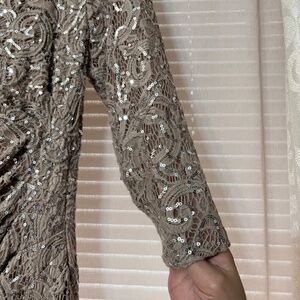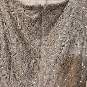 Beautiful lace style dress with sequins is fully lined and has a zipper back closure. 3/4 sleeves and a Slight leg slit (is not too high.)