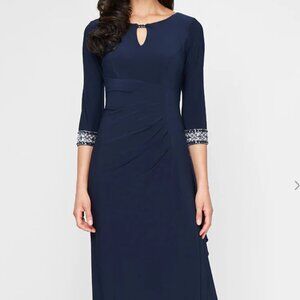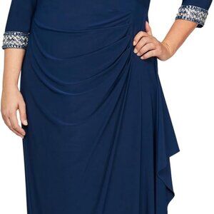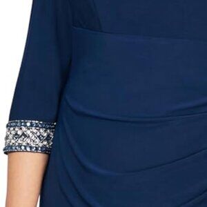 Alex Evenings cobalt blue (close to navy) dress, size Womens 16. Back zip up, sparkling sleeve detail and delicate draping, side slit. Generous stretch. Length from top of shoulder to back hem is about 57". Material: Polyester & Spandex, no bra cups. Worn once for 6 hours, has been dry cleaned. No damage noticed.