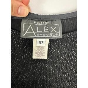 Elegant black sleeveless maxi dress by Alex Evenings, size 12 Petite. Features a shimmering textured fabric with subtle silver sparkle throughout, a classic scoop neckline, and a flattering column silhouette. Perfect for formal occasions, holiday parties, or evening events. Made in the USA from domestic and imported fabrics.