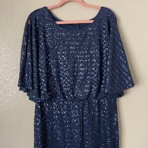 Alex Evenings Dress Womens Size 14 Blue Maxi Sequins Flutter Sleeve Cocktail