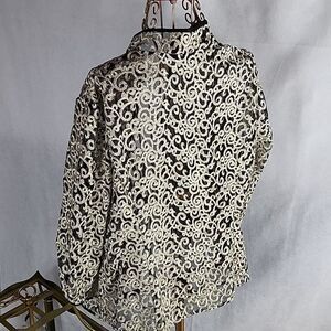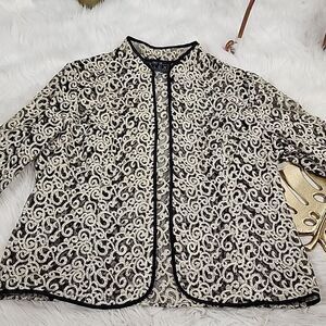 Beautiful evening jacket that would look lovely over a black strapless gown or pair with a satin chemise. Gold threaded embroidery on black mesh with black piping around entire jacket. Notched 3/4 sleeves, mandarin collar