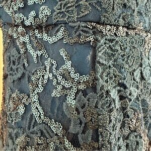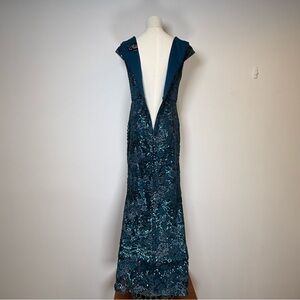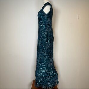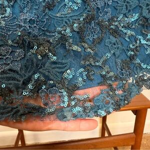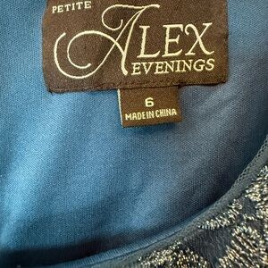 Step into elegance with this stunning Peacock blue lace Alex Evenings gown Women’s Size 6 Petite. Perfect for any formal occasion. Sparkle with sequins and embroidered lace, cap sleeves, fully lined, hidden back zipper, very good preowned condition. A couple of spots where lace has pulled away from embroidery and the bottom edge of gown has a bit of dust, barely noticeable, see last three pictures for reference. Approximate measurements 54” top of shoulder to hemline, 18” across chest, 16” across waist side to side.