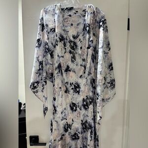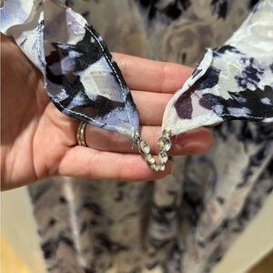 Chic sleeveless floral dress by Alex Evenings. Purple, black, pink, white floral pattern, Ideal for special events. Separate triangle shaped shall included with jewel on the ends.