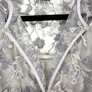 Sheer mesh jacket features purple and silver embroidered flowers with scalloped edgings