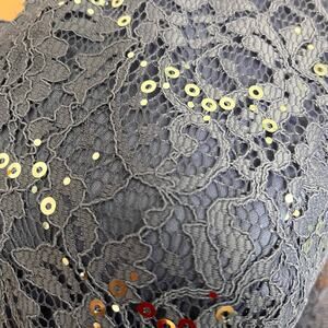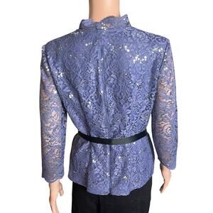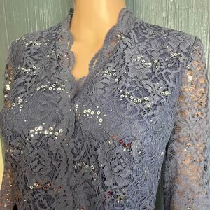 This grayish blue Alex Evenings lace and sequin evening wear top has a V-neck, and is belted with a black grosgrain ribbon. 62% polyester, 35% nylon, 3% spandex; lining & belt: 100% polyester. Hand wash and lay flat to dry. Three-quarter sleeve. Originally retailed for $139. This is the perfect top for an evening party, dinner, date, wedding guest, concert, theater. Lace cottage core style.