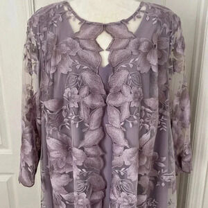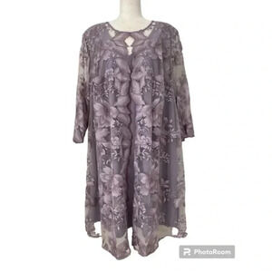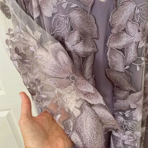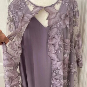 Elegant lavender dress with floral lace overlay. Features sheer sleeves and a keyhole neckline. Perfect for special occasions.