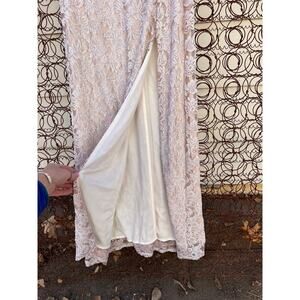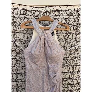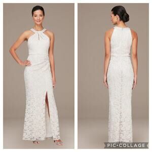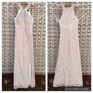 Alex Evenings Long Halter Lace Sheath Dress with Skirt Slit in Taupe Size 8