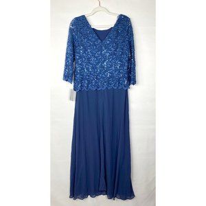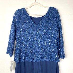 Alex Evenings Scallop Lace Mock Dress Chiffon Skirt Sequin Gown in Wedgewood Blue, Size 12.