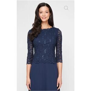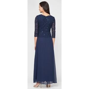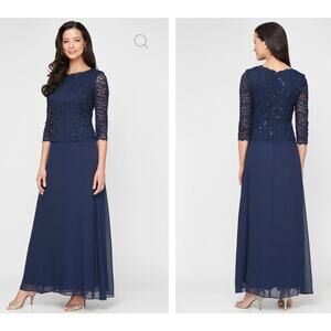 Alex Evenings Navy Long Gown with Sequin Lace Bodice & Chiffon Skirt 6 NWT