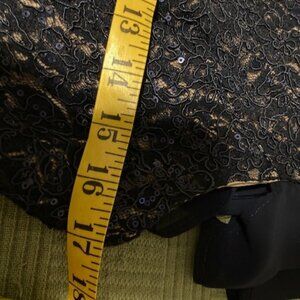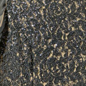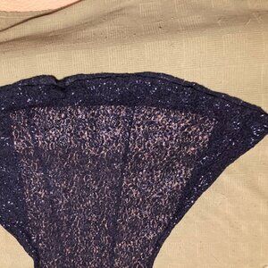 Beautiful Alex Evenings navy blue trumpet/fit & flare dress. Beautiful lace with sequins, detached flutter sleeves, crew neck, zip back. Lace overlay allows the nude lining to show through just enough. Dress has some stretch to it. Measurements are 17" pit-to-pit; 15.5" across the front waist; 59" long. Beautiful and elegant. Perfect for mother of the bride/mother of the groom/special occasion. Non-smoking home.