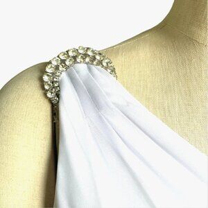 Make a statement at your next formal occasion with this stunning Alex Evenings one-shoulder maxi dress. The dress features a colorblock design in black, white, and multicolor with accents such as a circular rhinestone shoulder broach and straps adorned with rhinestones. The dress has a one-shoulder neckline and a zip closure, with a long dress length that adds elegance to your look. It also has features like a lined interior, collarless style, empire waist, and a slit for added comfort. This dress is perfect for weddings, parties, and formal events, and is available in size 4.