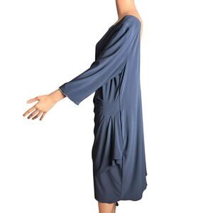 This grayish blue Alex Evenings midi dress has a ruched skirt that drapes to the hem, 3/4 sleeves, boat neck. The neckline and cuffs are accented with rhinestones. 96% polyester, 4% Spandex with a polyester lining. Hand wash and line dry. Back zipper closure. Party, cocktail party, holiday, wedding guest, dancing, resort wear, evening wear.
