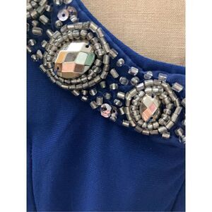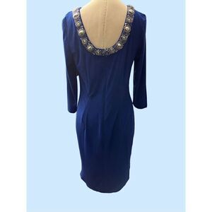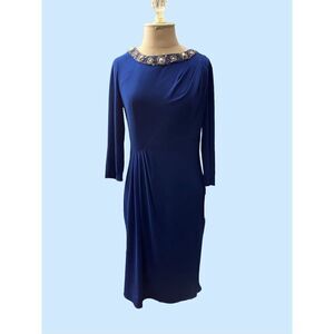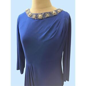 Alex Evenings presents this lovely Sapphire Blue Cocktail Dress that you will be thrilled to have in your closet. The silver mock stone embellishments around the neckline are stunning. Fully lined, 3/4 sleeve, with just a smidge of spandex. The ruching at the bust and below the waist is flattering and feminine. Zips up the best for closure.