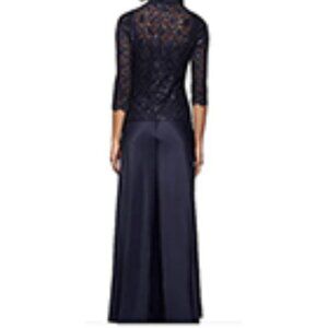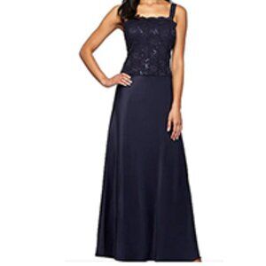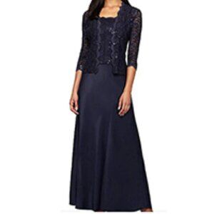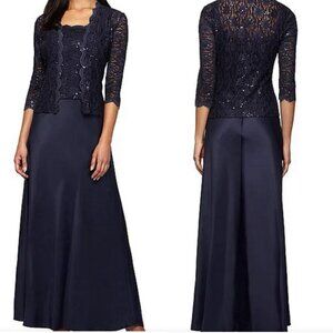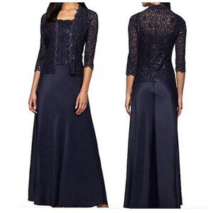 Alex Evenings Sequin Embellished Floral Lace Square Neck A-Line 3/4 Sleeve Satin 2-Piece Jacket Gown New With Tags Color: Navy Size: 14 Jacket: Sequin embellished lace fabrication Open neckline 3/4 sleeves Scalloped trim detail Open front; no closure Approx. 21.5" length Lace: polyester satin Machine wash Gown: Sequin embellished lace and satin fabrications Square neckline Sleeveless Center back zip closure Approx. 50.5" dress length Polyester/nylon/spandex Lace: polyester satin Machine wash