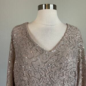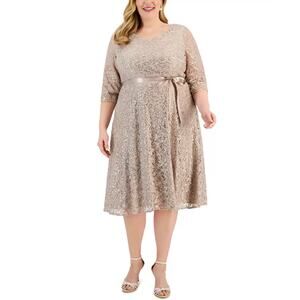 Alex Evenings Sequined Lace Cocktail Dress Size 24W Taupe Belted Fit and Flare