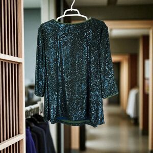 This is a stunning evening blouse by Alex Evenings that is brand new with tags. This stunning blouse is fully lined, has a gorgeous allover sequin design, 1/2 sleeves and a relaxed fit. This top would be perfect for any special occasion like weddings, a night out or a dinner party. This top has a nice weight to it so it hangs beautifully!!