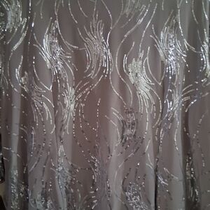 Chic asymmetrical dress with shimmering silver accents. Perfect for elegant occasions.