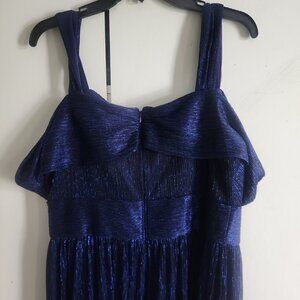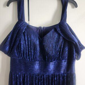 Floor length, straps plus off the shoulder detail, built-in padding for chest, hemmed to fit a 5'5" height with flat shoes. Shimmery fabric.