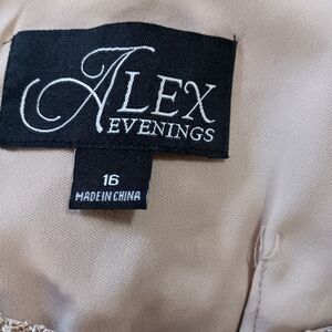 Alex Evenings size 16 Taupe sleeveless sheath dress. Knee-Length, all over sequin lace. Part of a 2-piece set. DRESS ONLY is for sale. 58% Nylon, 40% Polyester, 2% Spandex. Square neckline, sleeveless design, scalloped hem, and back slit. This is a stunning dress that features a comfortable stretch, fully lined, and has a back zipper closure. Ideal for Mother of the Bride/Groom, wedding guest, cocktail party, formal cruise or holiday event. Length 46 in chest 20 in.