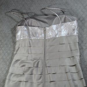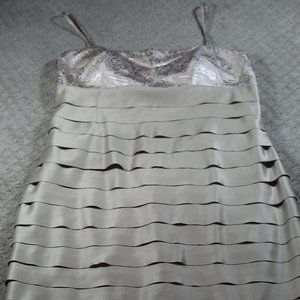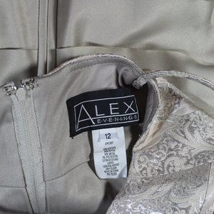 Alex Evenings Formal Dress in excellent pre-loved condition! Taupe neutral color with metallic tone on tone patterned bust and satin mesh layers. Fully lined! Perfect as a mother of the bride dress or cocktail evening.