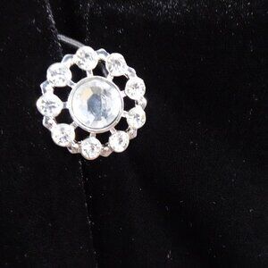 Jacket has rhinestone button closure on front